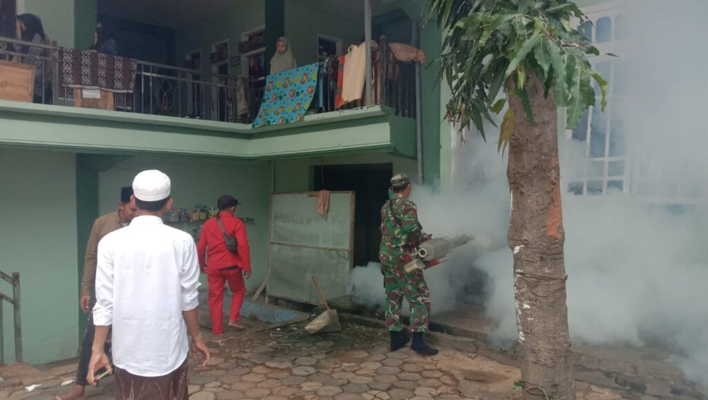 Sampang – Dalam upaya mencegah penyebaran penyakit Demam Berdarah Dengue (DBD), Babinsa Koramil 0828/08 Sokobanah bersinergi dengan tenaga kesehatan Puskesmas Batu Lenger melaksanakan kegiatan pendampingan fogging di Pondok Pesantren Mambaul Ulum, Desa Bira Timur, Kecamatan Sokobanah, Kabupaten Sampang.(7/1/26) Kegiatan fogging ini dilakukan sebagai langkah antisipatif untuk memberantas nyamuk Aedes aegypti, khususnya di lingkungan pondok pesantren yang memiliki aktivitas santri cukup padat. Kehadiran Babinsa dalam kegiatan tersebut merupakan bentuk dukungan TNI dalam menjaga kesehatan masyarakat serta memperkuat sinergitas dengan instansi kesehatan.