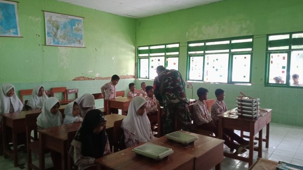 Sampang – Babinsa Koramil 0828/10 Kedungdung, Sertu Gunarso, melaksanakan pendampingan kegiatan pendistribusian Makan Bergizi Gratis (MBG) di salah satu sekolah yang berada di Desa Rohayu, Kecamatan Kedungdung, Kabupaten Sampang Kegiatan ini merupakan bentuk dukungan TNI AD melalui peran Babinsa dalam menyukseskan program pemerintah guna meningkatkan kualitas gizi anak-anak sekolah sejak dini. Dalam pelaksanaannya, Sertu Gunarso turut memastikan proses pendistribusian berjalan aman, tertib, dan tepat sasaran. Sertu Gunarso menyampaikan bahwa pendampingan ini bertujuan untuk memberikan rasa aman serta memastikan para siswa menerima makanan bergizi yang layak. “Melalui program MBG ini, diharapkan dapat membantu mencukupi kebutuhan gizi anak-anak sehingga mendukung tumbuh kembang serta meningkatkan semangat belajar mereka,” ujarnya.