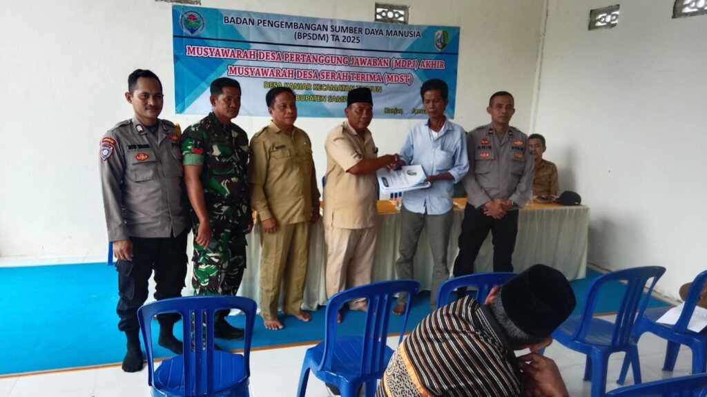 Sampang – Babinsa Koramil 0828/04 Torjun, Koptu Nanang, melaksanakan kegiatan pendampingan dan monitoring Musyawarah Desa (Musdes) Pertanggungjawaban Akhir Tahun sekaligus Serah Terima Jabatan yang bertempat di Balai Desa Kanjar, Kecamatan Torjun, Kabupaten Sampang. Kegiatan Musdes ini diselenggarakan sebagai bentuk transparansi dan akuntabilitas pemerintahan desa kepada masyarakat terkait pelaksanaan program dan penggunaan anggaran desa selama satu periode kepemimpinan. Dalam kesempatan tersebut, dilakukan pemaparan laporan pertanggungjawaban akhir serta prosesi serah terima tugas kepada pejabat selanjutnya.