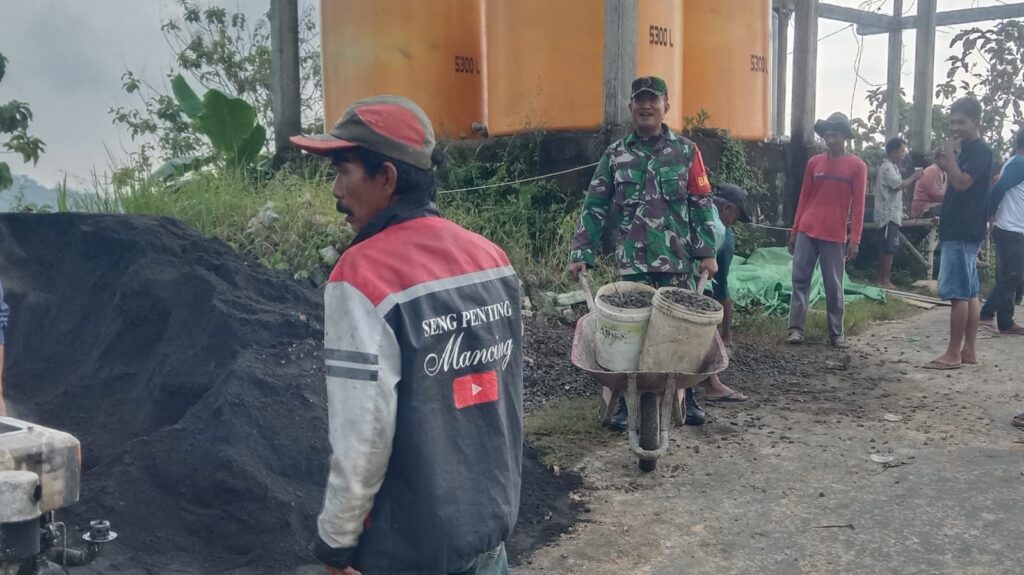 Sampang – Kebersamaan dan semangat gotong royong kembali terlihat di Desa Tambelangan, Kecamatan Tambelangan, Kabupaten Sampang. Babinsa Koramil 0828/11 Tambelangan, Serda Yakub, turut terjun langsung bersama warga melaksanakan kegiatan rabat jalan desa sebagai upaya meningkatkan akses dan kenyamanan masyarakat dalam beraktivitas. Kegiatan yang dilaksanakan dengan penuh semangat ini menjadi bukti nyata kemanunggalan TNI dengan rakyat. Sejak pagi hari, Babinsa bersama warga bahu-membahu mencampur material, meratakan adonan semen, hingga memastikan proses pengerjaan berjalan dengan baik.